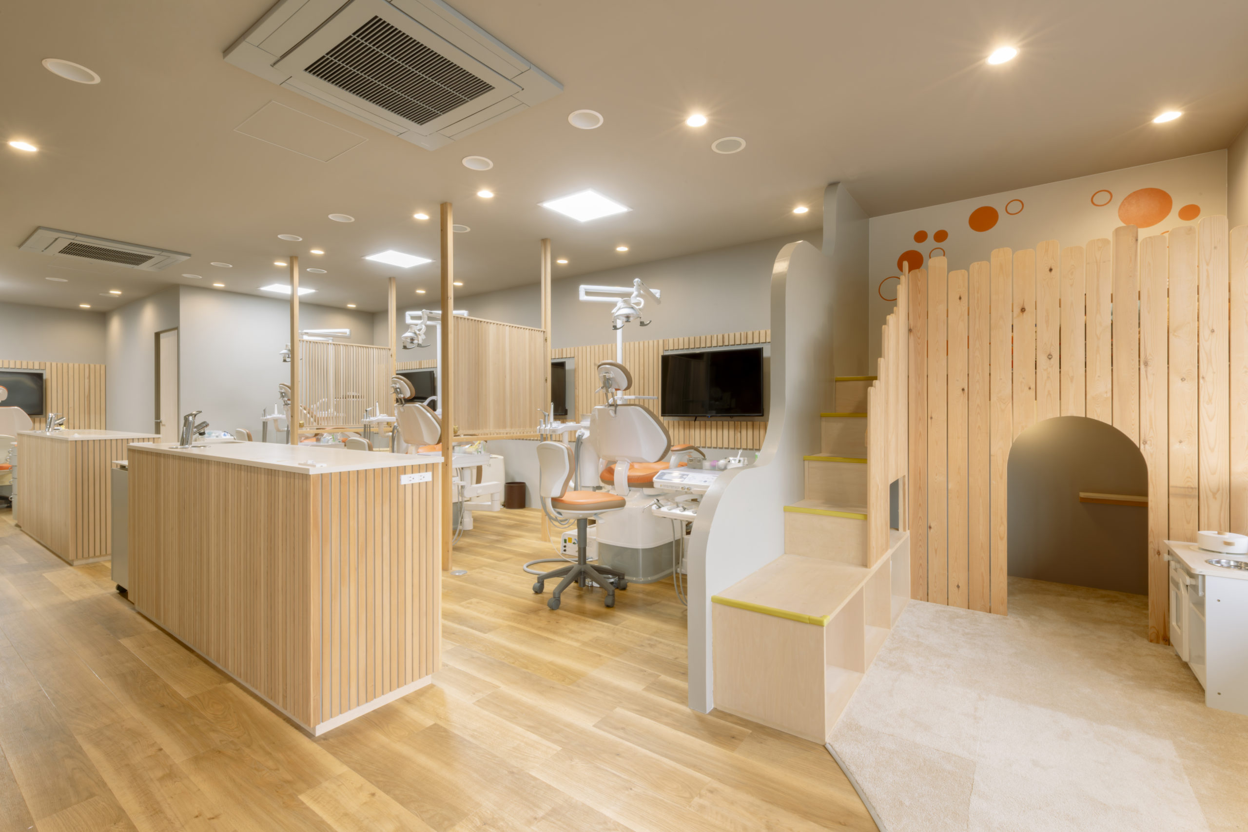 治療室は、それぞれ木ルーバーやガラス窓で柔らかく空間を仕切っている。キッズスペースの様子が見通せる計画とすることで、治療中の大人も安心して過ごせる空間とした。