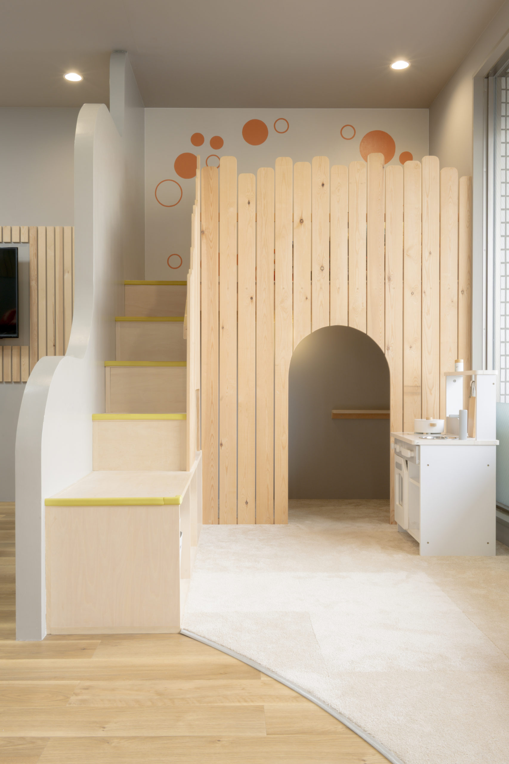 キッズスペースは、子どもの成長とともに使われ方が変わっていくことを前提に、つくり込みすぎない設えとした。遊び方や居場所が、自然と更新されていく余白を残している。
