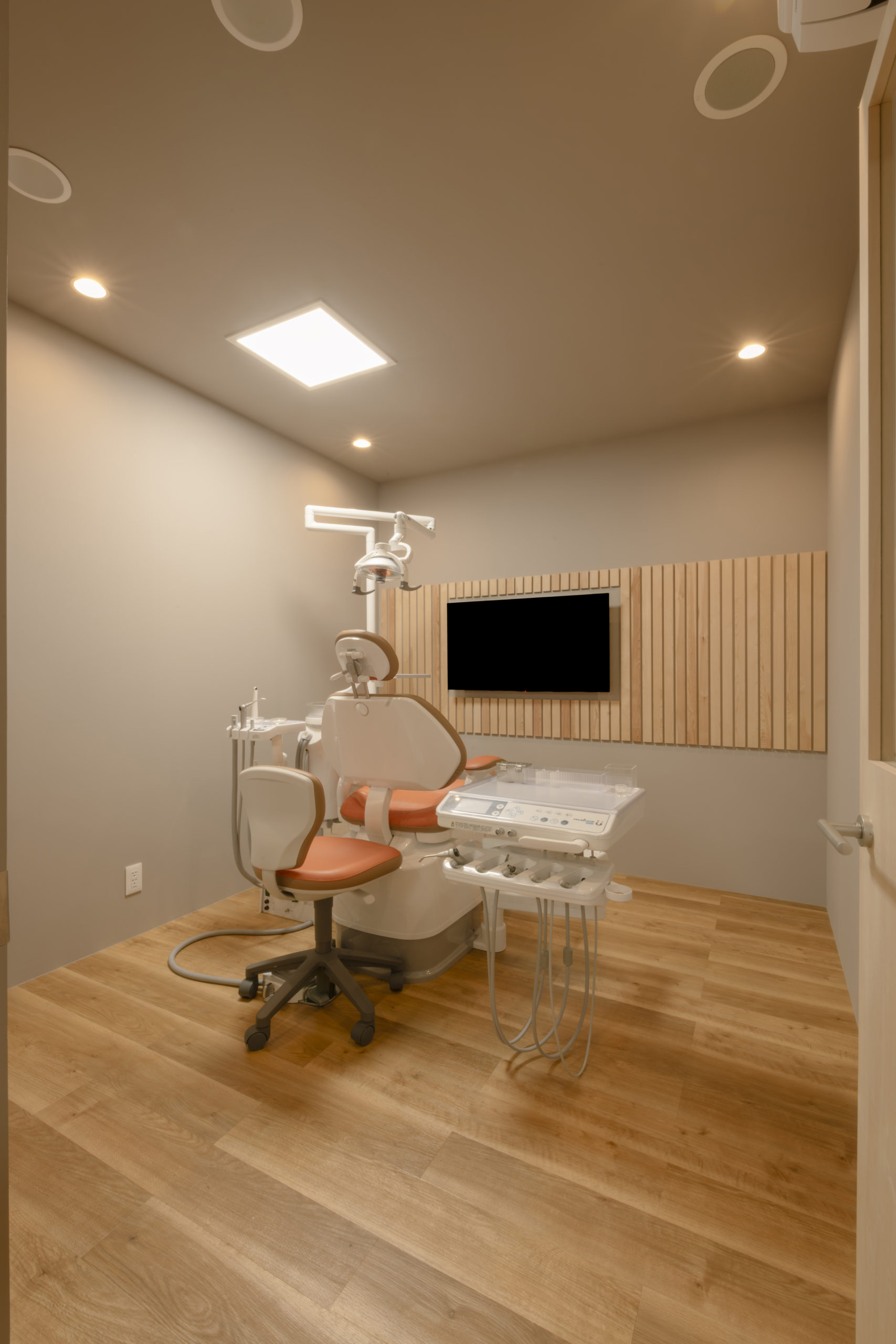 ベースカラーはライトグレーとシナランバーのナチュラルな木調をベースに、歯科医院としての清潔感を大切にした。