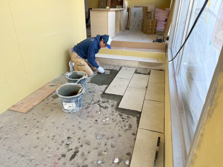 子どもにも親しみやすいカラーを空間のアクセントとして、サインペイントやタイル目地など、ところどころにオレンジを散りばめている。