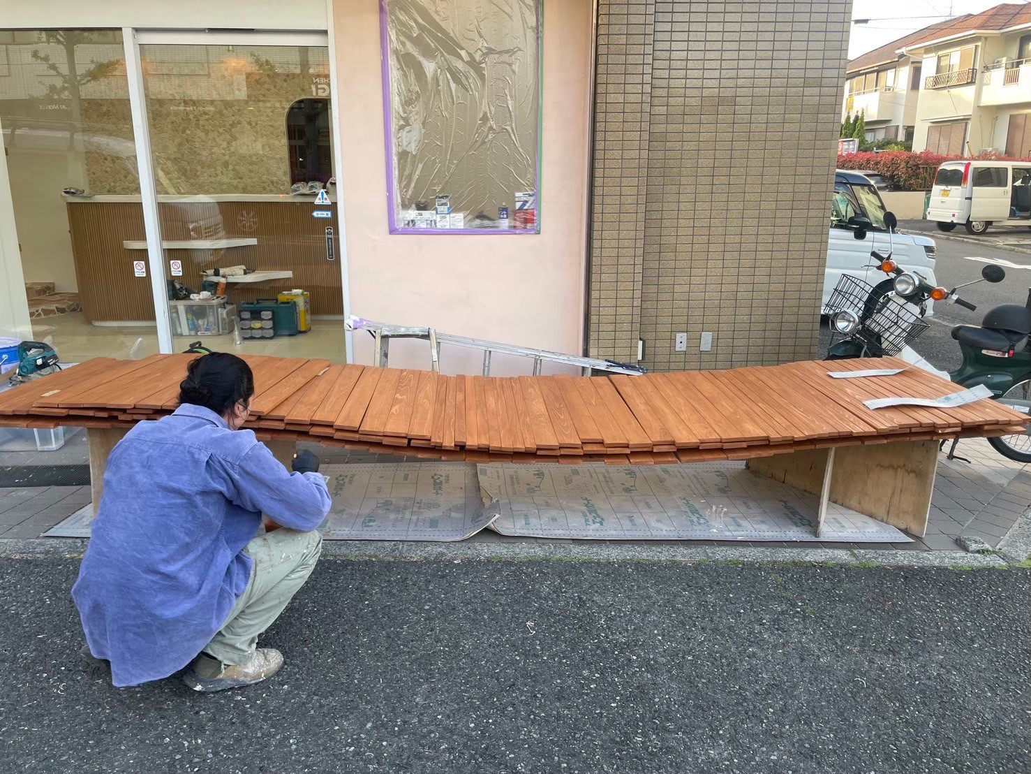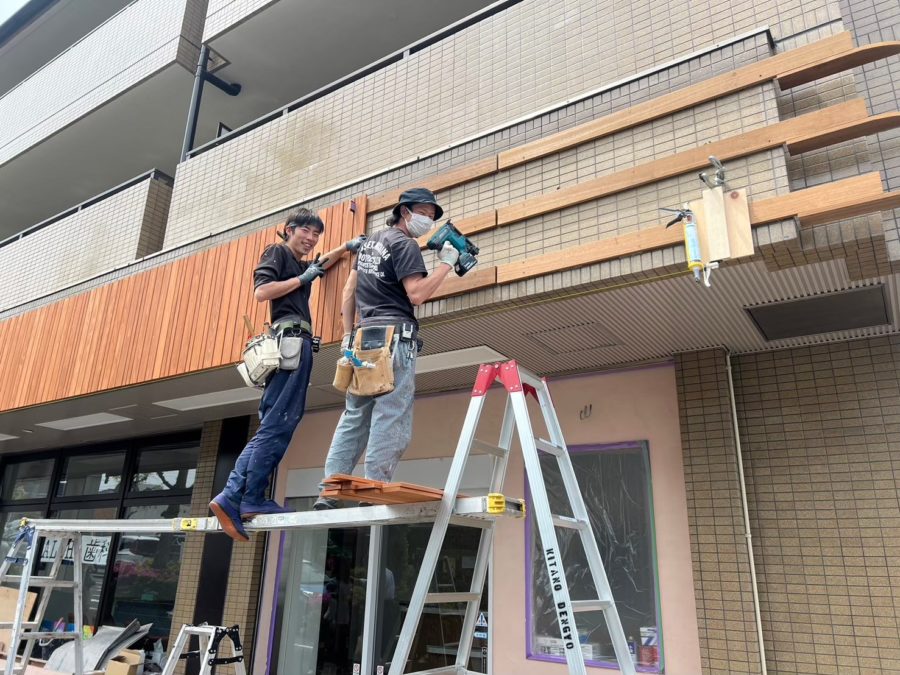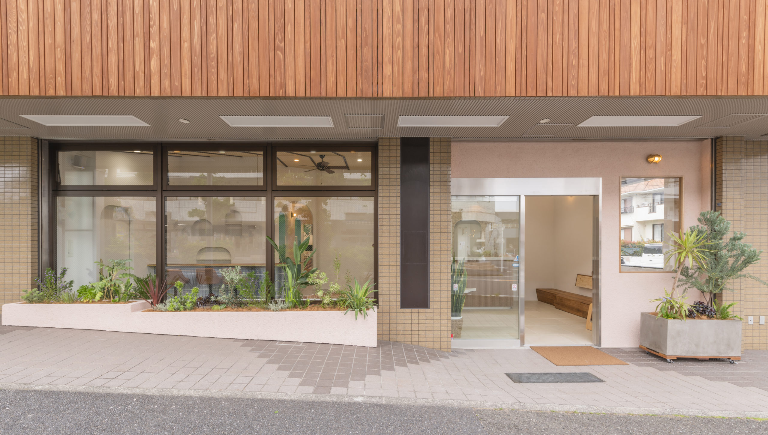 外観は、既存のタイル壁を植栽でやわらかく囲い、エントランスの庇を木の縦貼りで仕上げることで、街に対して親しみのある表情をつくり出した。