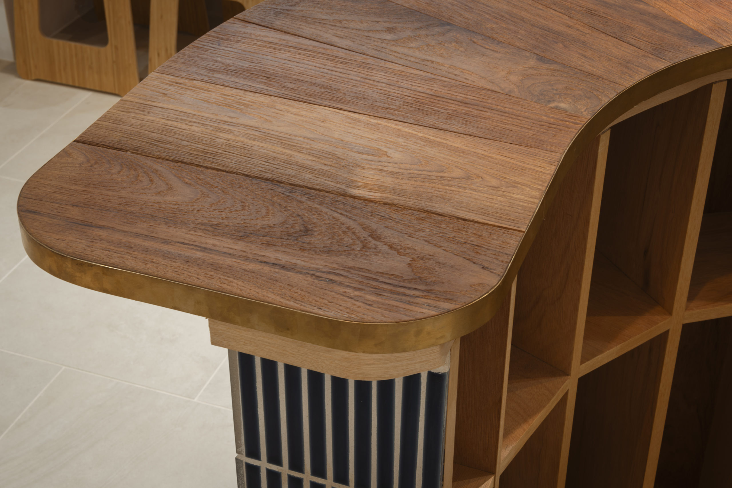 奥に設けたもうひとつのカウンターは、受付という機能にとどまらず、バーのように腰掛けてくつろげる場所として、オーナーの要望を反映したもの。