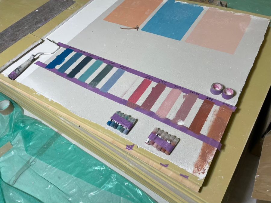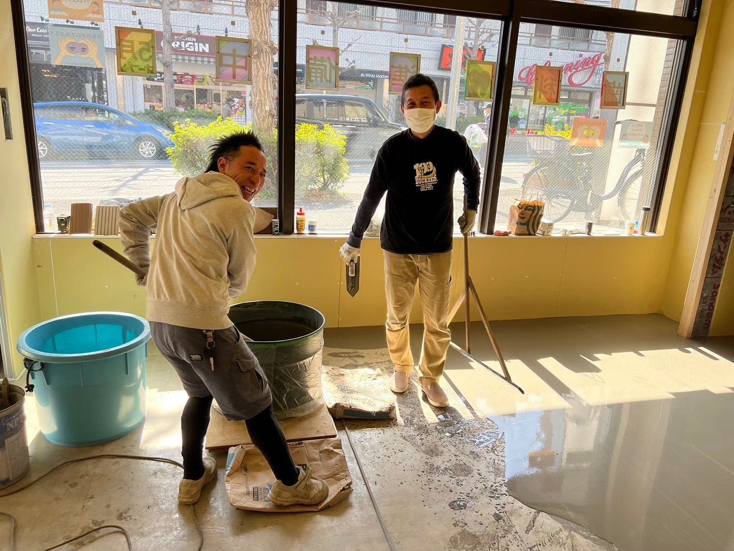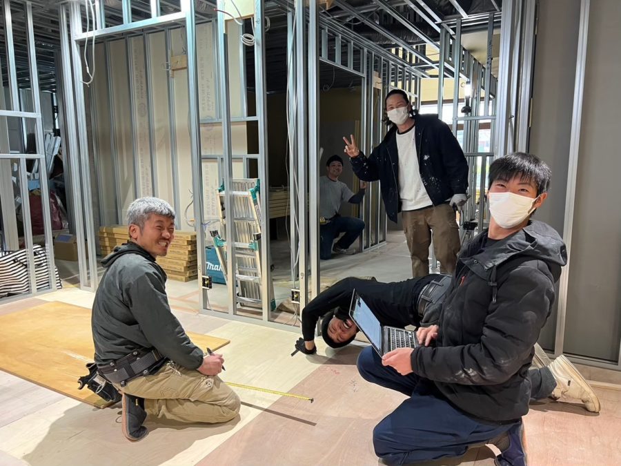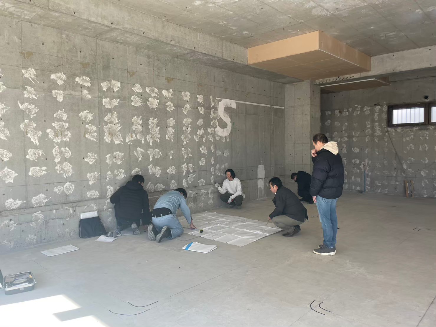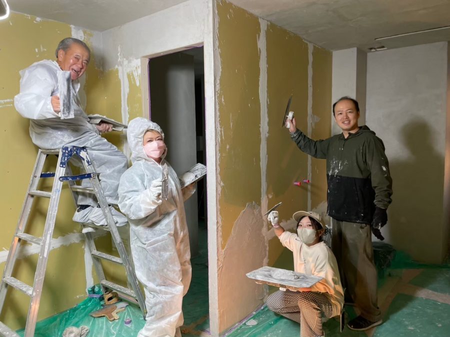 内装仕上げでは、プラスターボードの上に塗装で均一に仕上げるのではなく、下塗り材として使用するユートップの左官ムラをあえて残し、手仕事の表情が感じられる、ざらりとした質感とした。