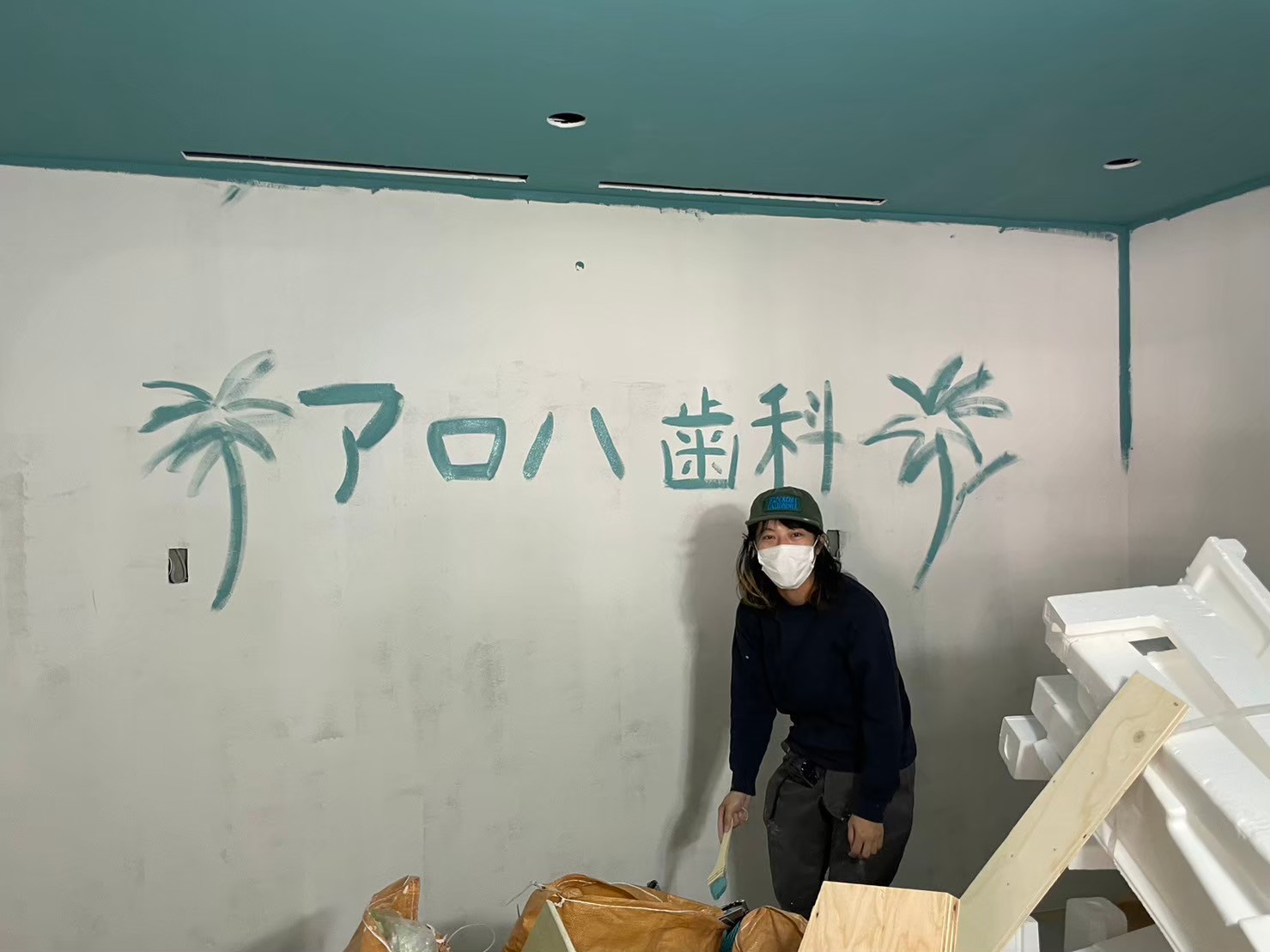 ホワイトの治療室には、グリーンのプルメリアの壁画を。