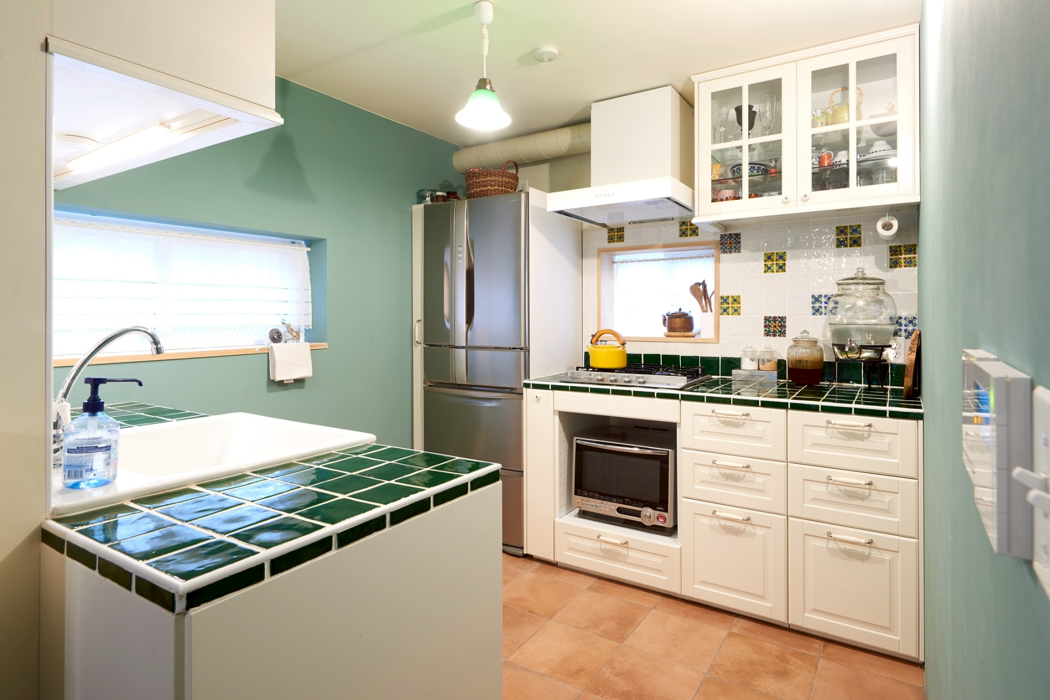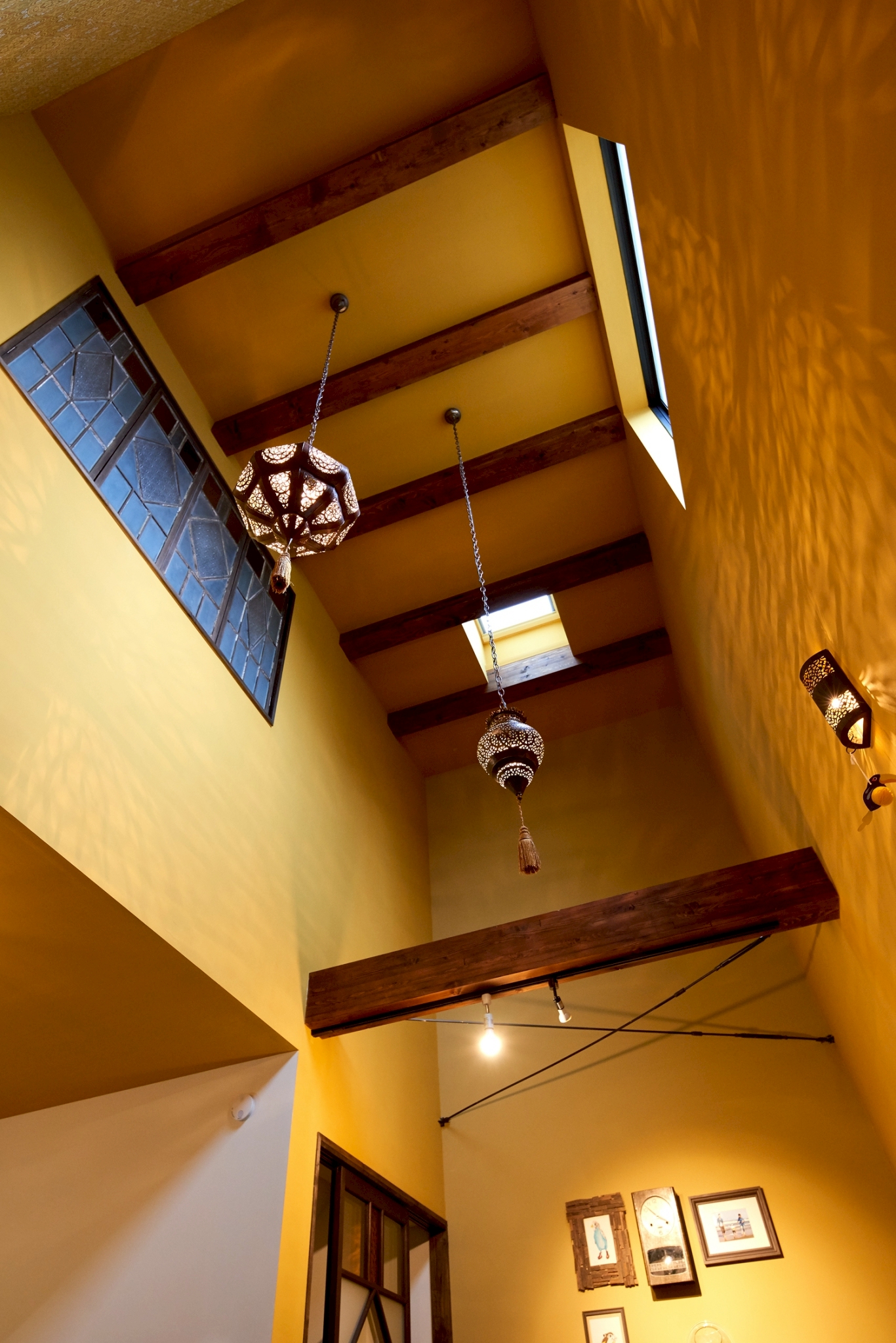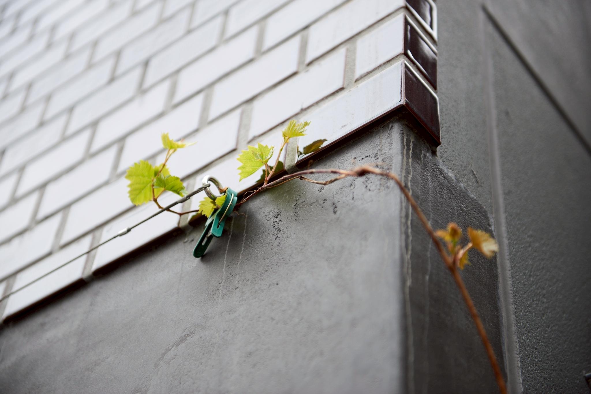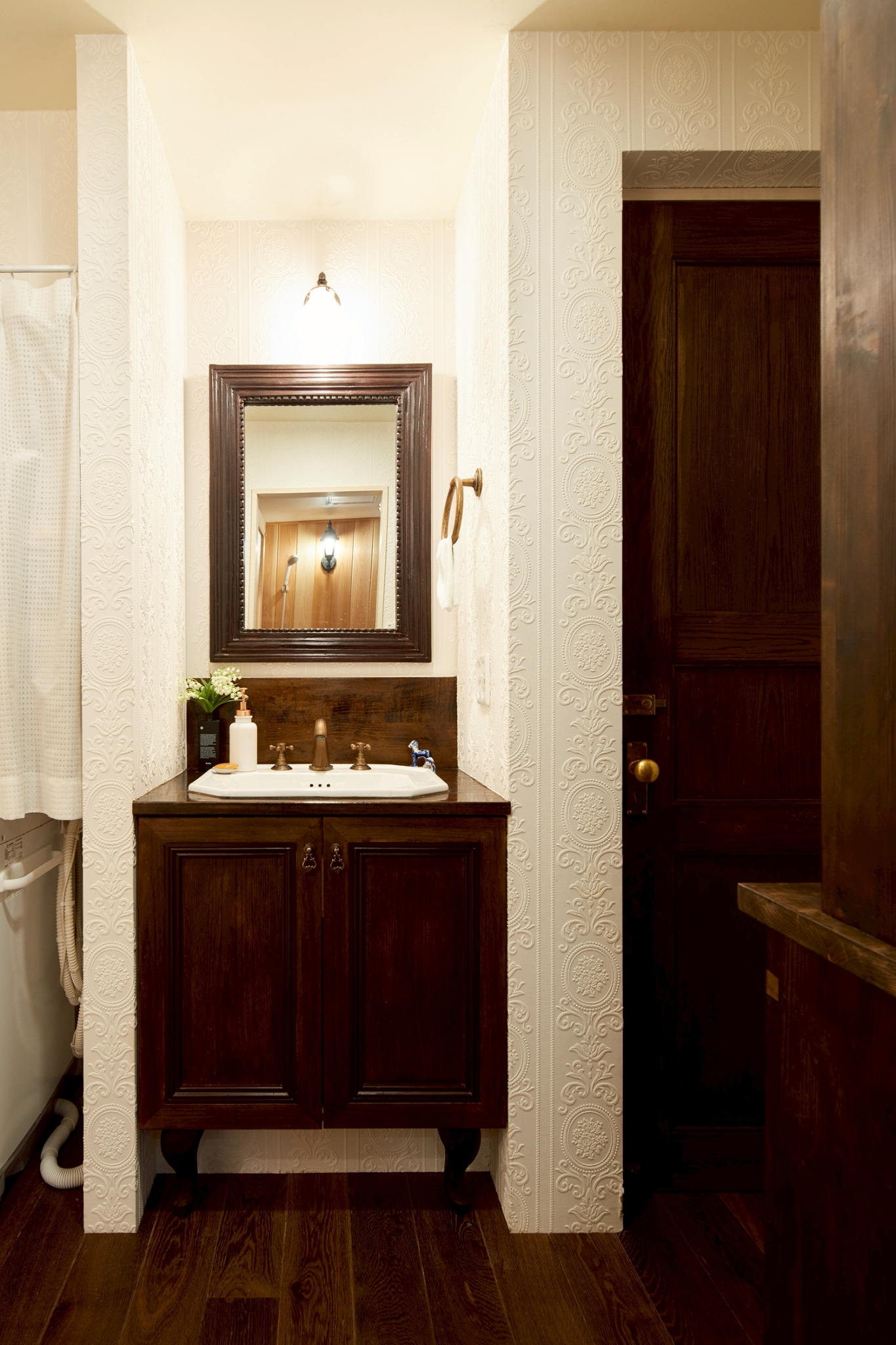 外構と内装には、ご夫妻の手が色濃く残っており、玄関まわりにはご主人の実家から持ち帰った手押しポンプを再利用し、葡萄棚をしつらえた苗木はやがてアーチを描くまでに育った。室内は塗装壁を基調に、輸入クロスやトルコタイルを合わせ、レスキューしたサッシやアンティークの格子を再構成した。