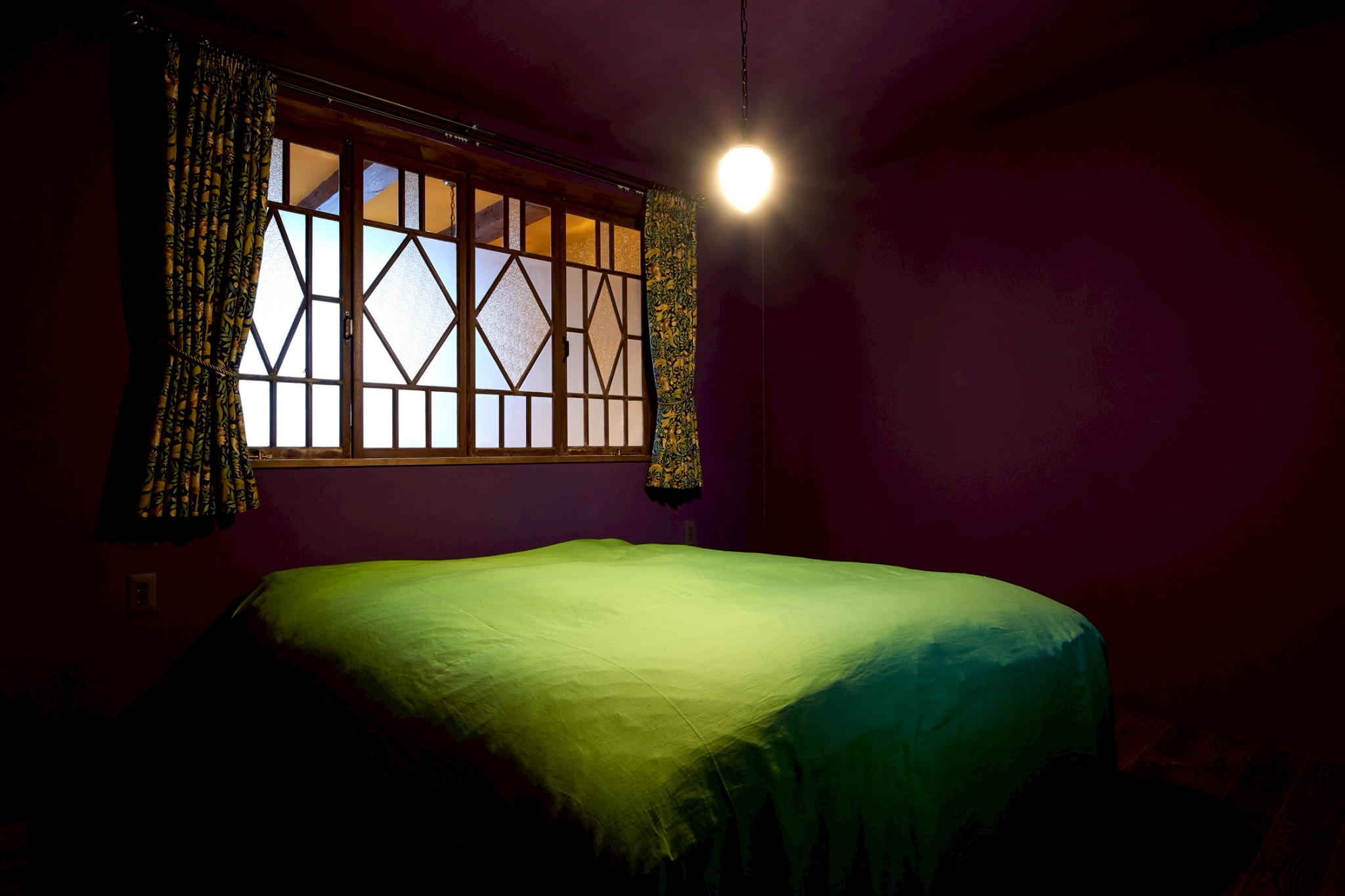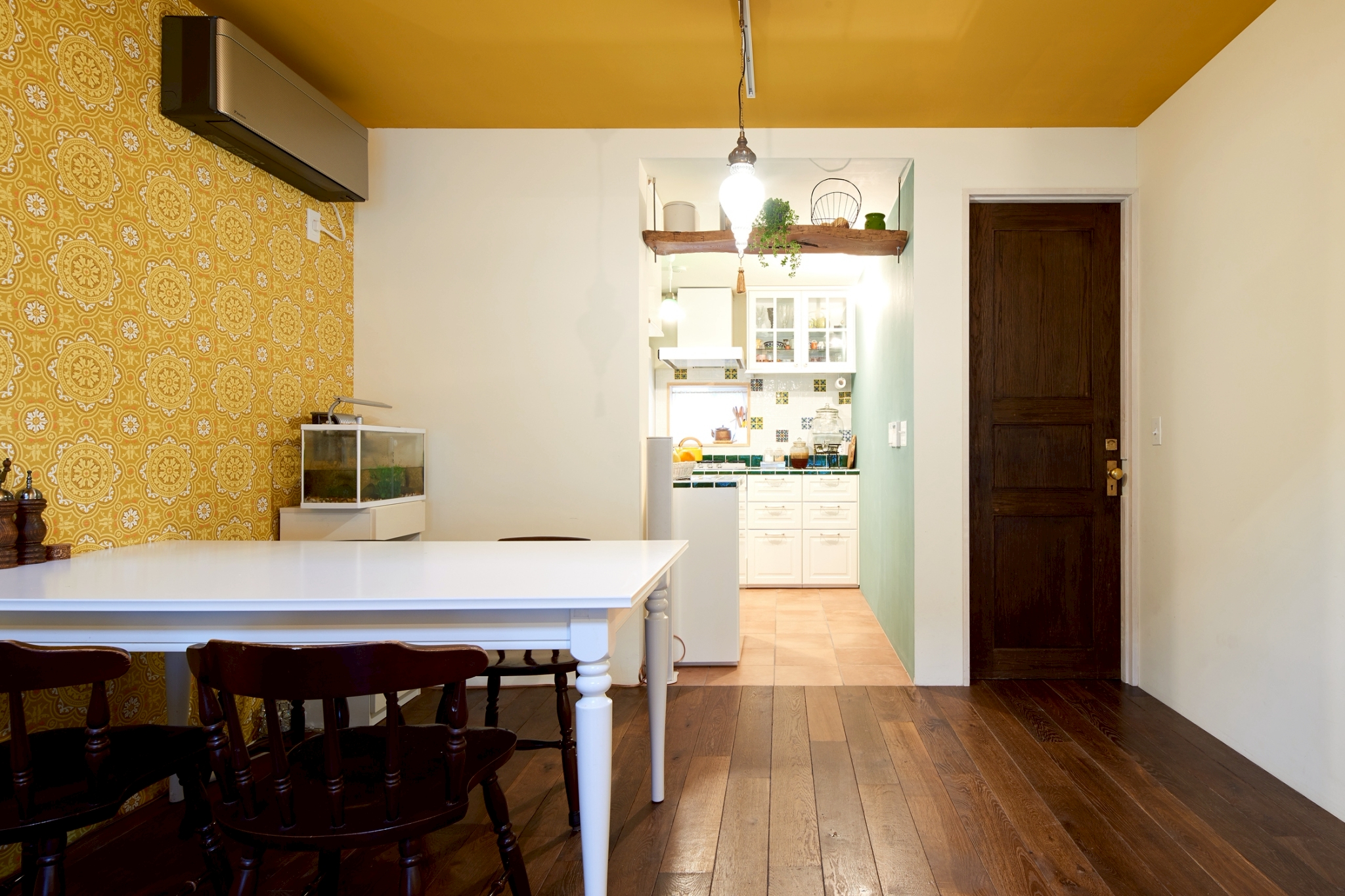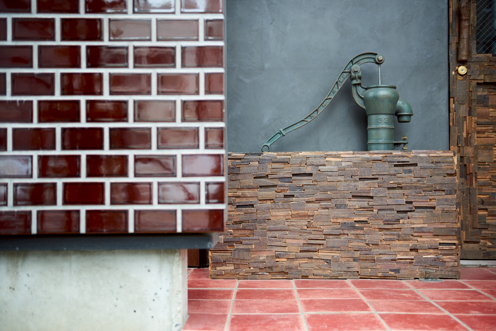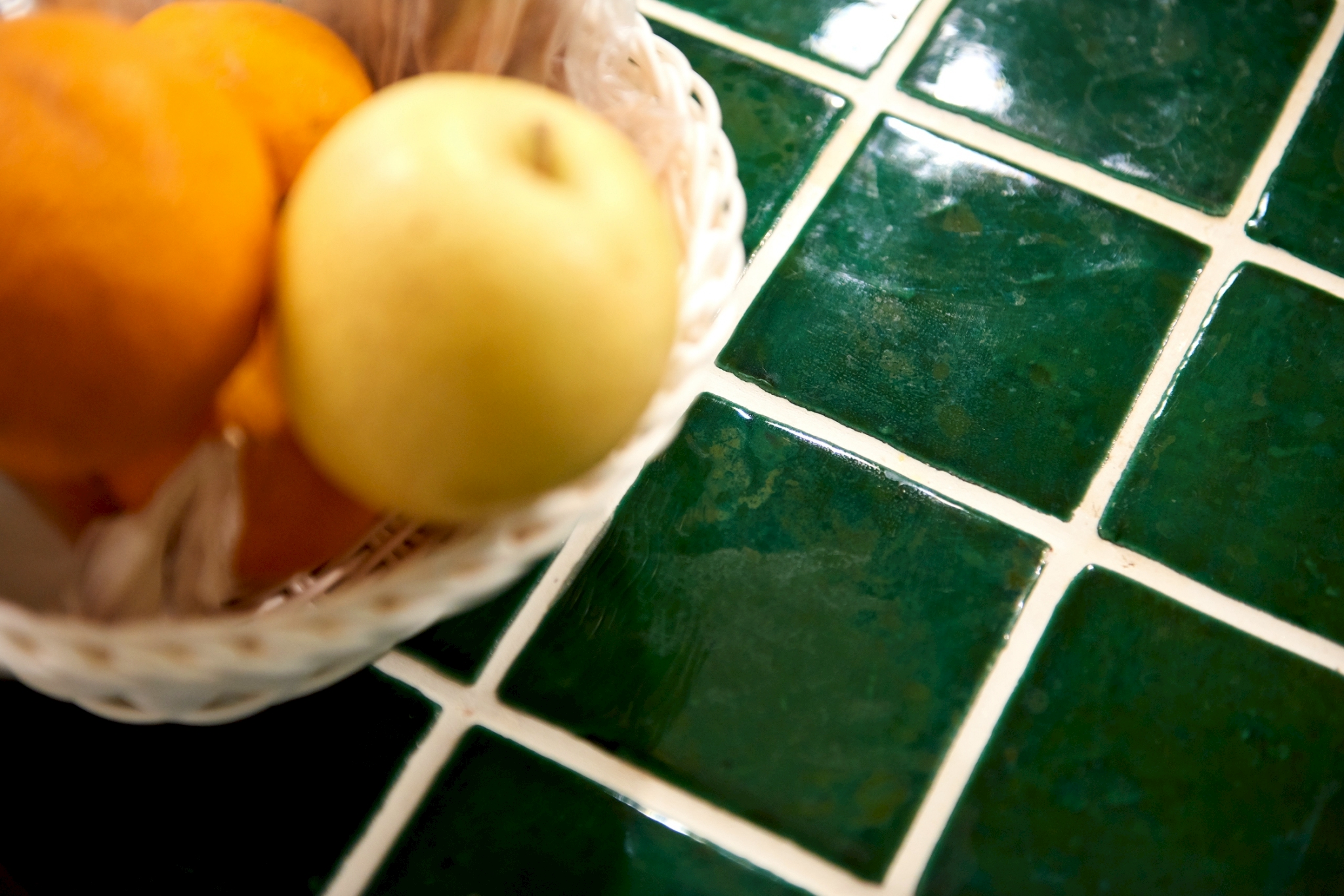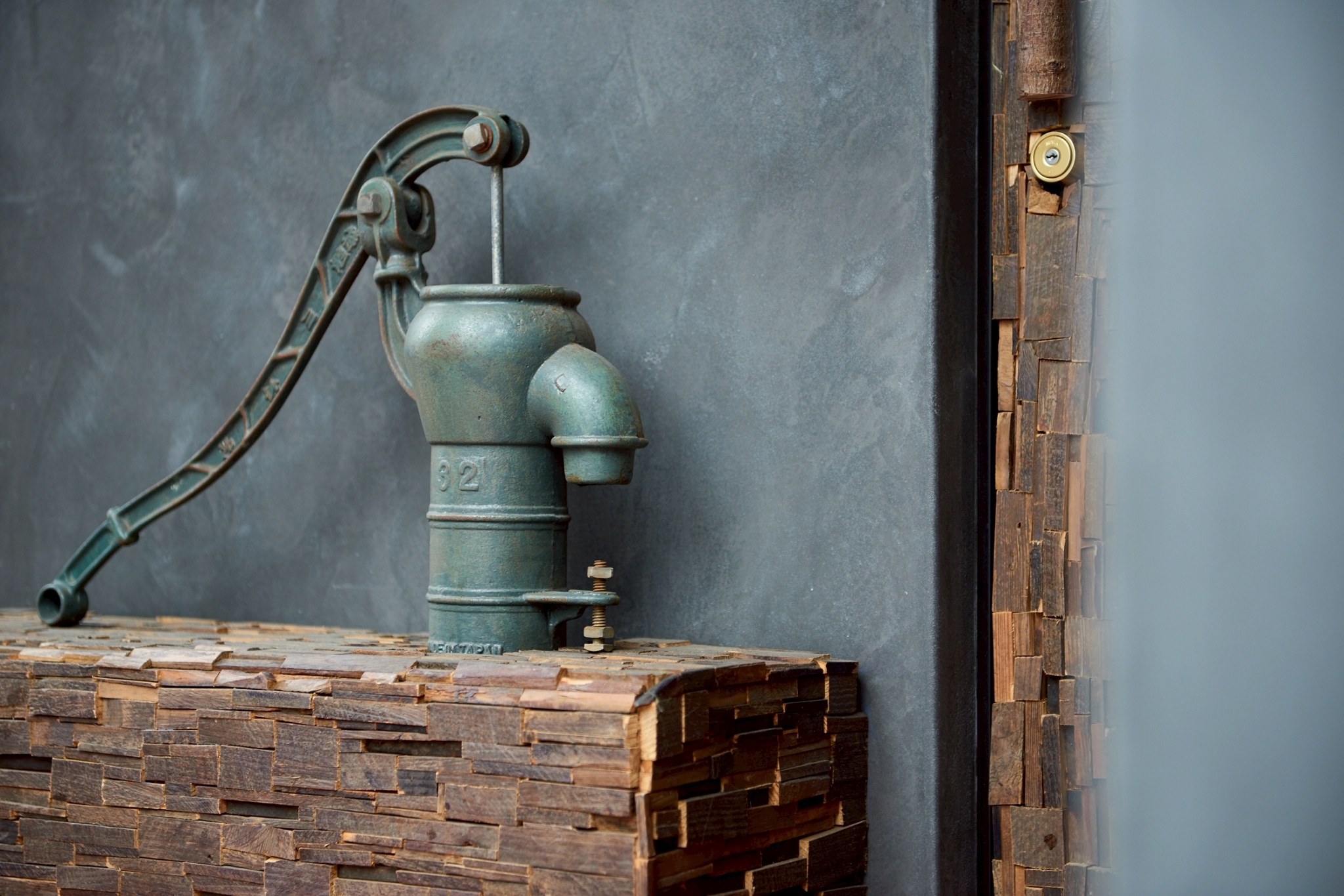 外構と内装には、ご夫妻の手が色濃く残っており、玄関まわりにはご主人の実家から持ち帰った手押しポンプを再利用し、葡萄棚をしつらえた苗木はやがてアーチを描くまでに育った。室内は塗装壁を基調に、輸入クロスやトルコタイルを合わせ、レスキューしたサッシやアンティークの格子を再構成した。