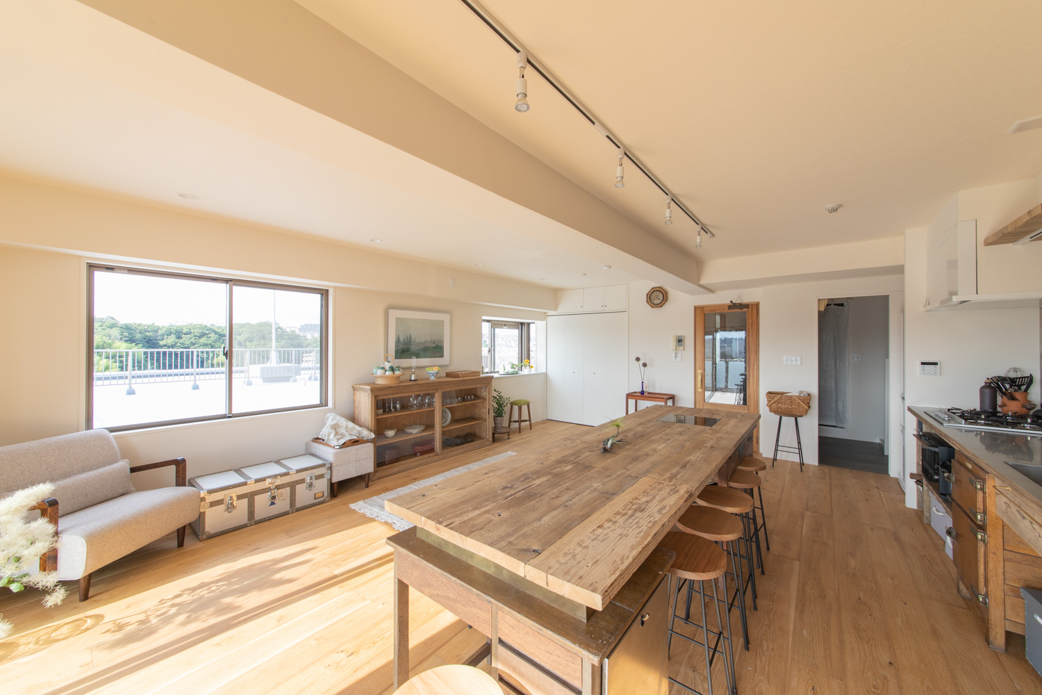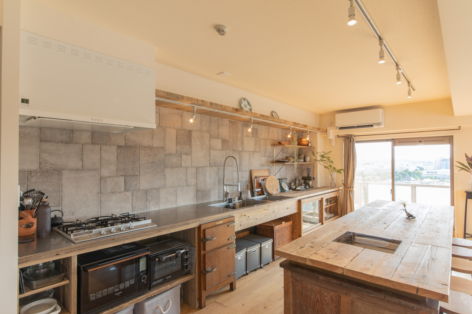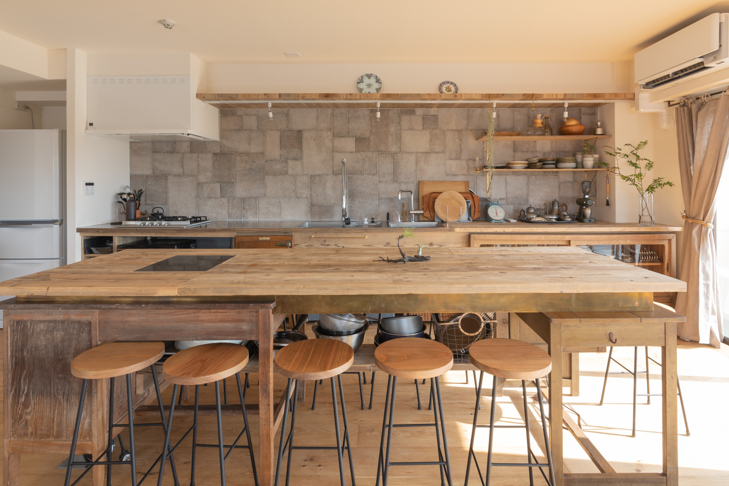 キッチンには壁一面に設置された長いキッチンと作業台を兼ねた大きなテーブル。