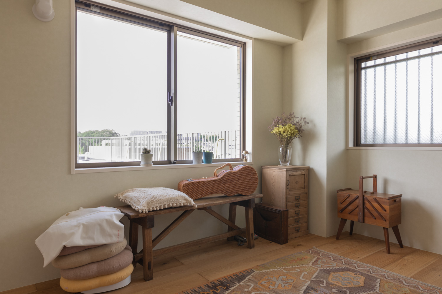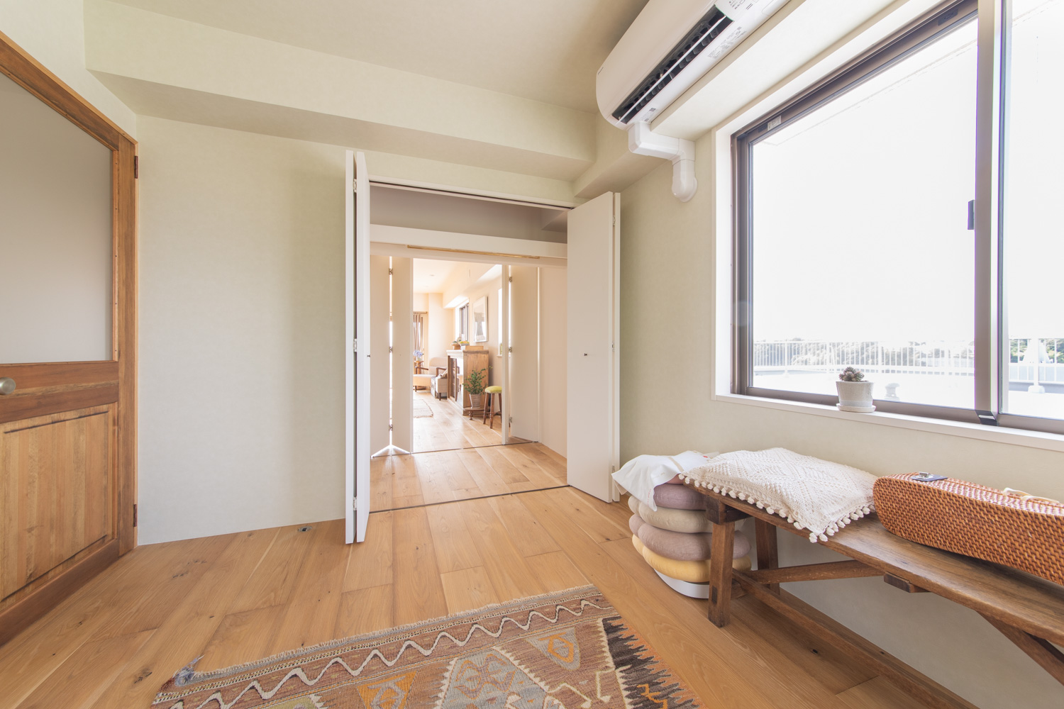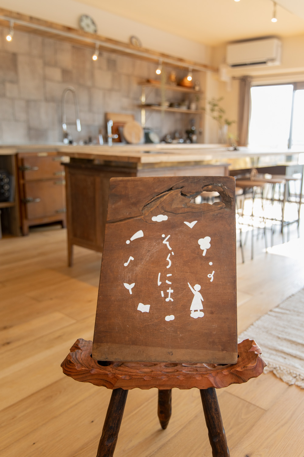半割にしてやすることで古さと新しさ、粗さと綺麗さが心地よく同居する表情が引き出された。バルコニーの向こうには大空が広がり、風が室内を通り抜ける中で、訪れた人が思い思いに時間を過ごすことが出来る。