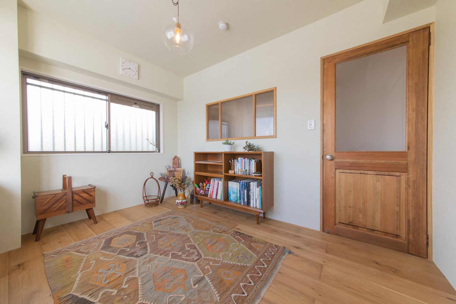 暗くなりがちな北側の廊下には室内窓で明かりを取り入れる。