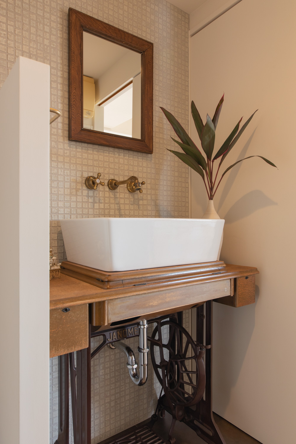 「新しいけど、なつかしい」をテーマとし、古材やミシン台など、古いものに手を加え、新しい形で使うアップサイクルを試みた。