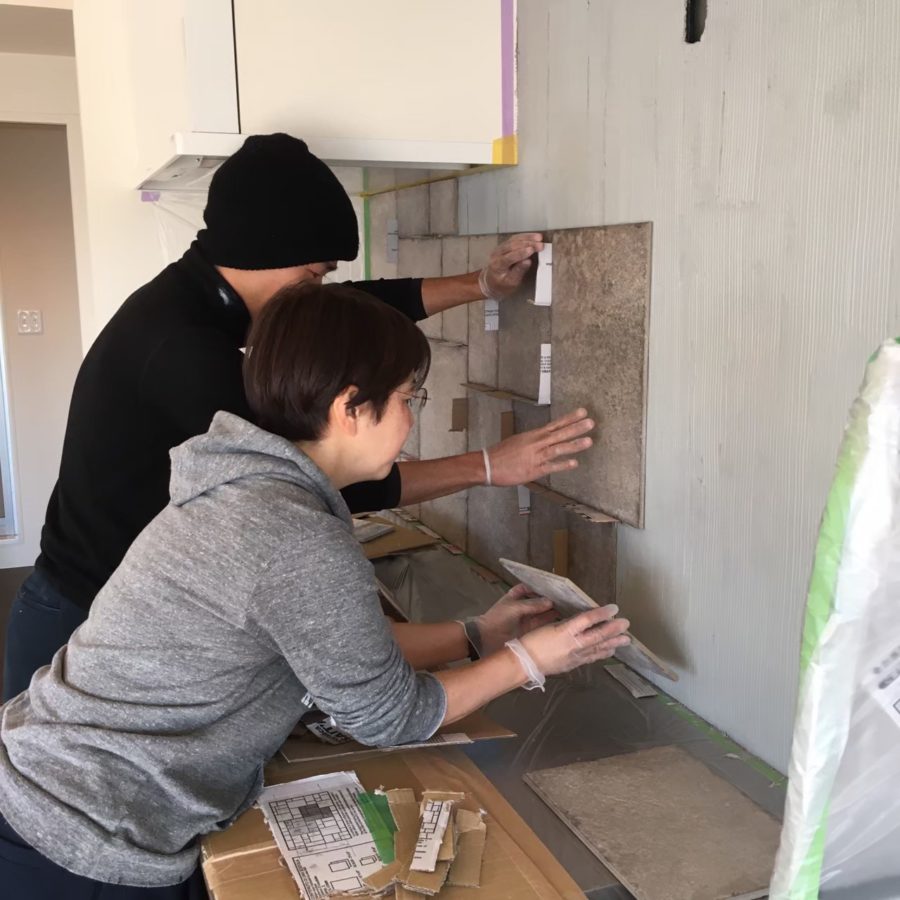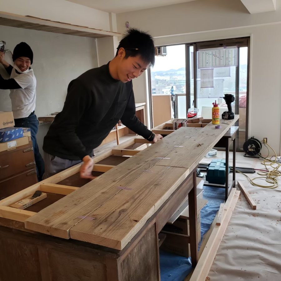 古家具の食器棚に天板を乗せてキッチンを造るという構想だけを持ち、プロジェクトオーナーと一緒に栃木県益子町へ。現地で実際に見て、寸法を測って、妄想をカタチにしていく。